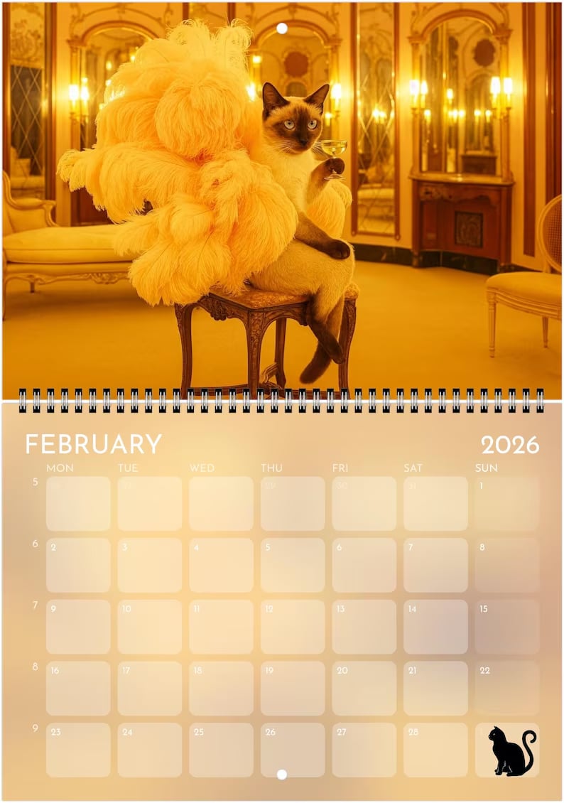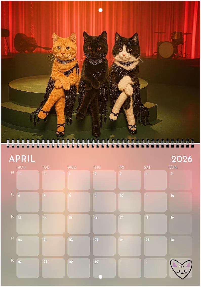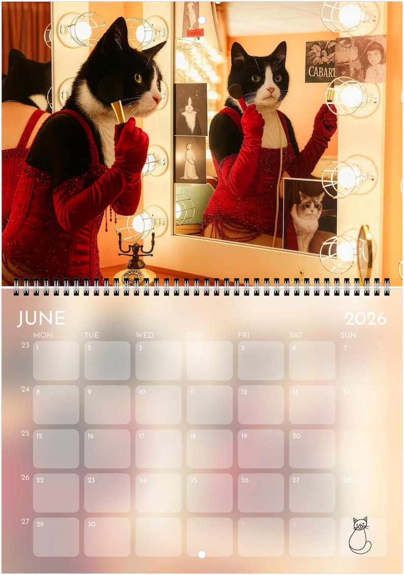 Step into the spotlight with this purrfectly over-the-top 2026 wall calendar — a dazzling fusion of feline elegance and showbiz flair. Each month features a stunning, original cat portrait inspired by the golden age of showgirls, stage lights, and pop-culture glamour.