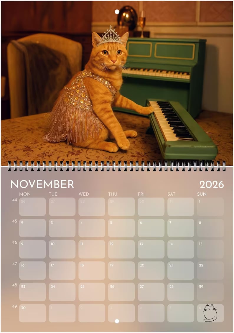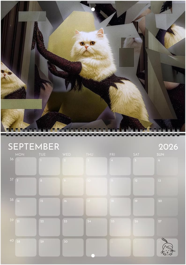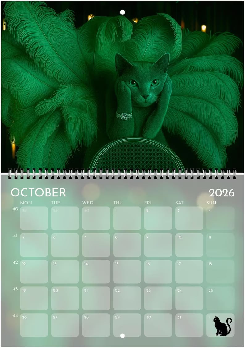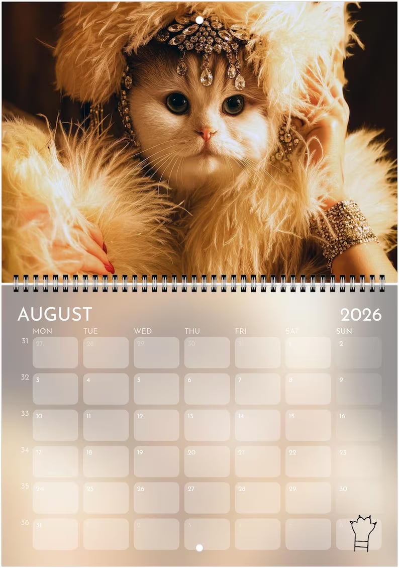 Step into the spotlight with this purrfectly over-the-top 2026 wall calendar — a dazzling fusion of feline elegance and showbiz flair. Each month features a stunning, original cat portrait inspired by the golden age of showgirls, stage lights, and pop-culture glamour.