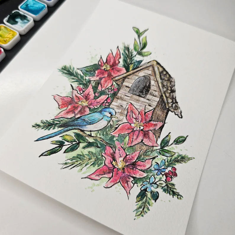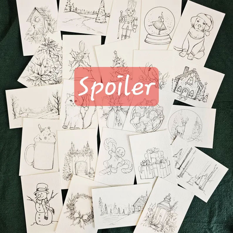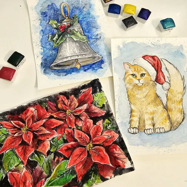⭐24 Numbered envelopes containing 4.5x6" Surprise holiday watercolor images on 140lb watercolor paper with Paint set.