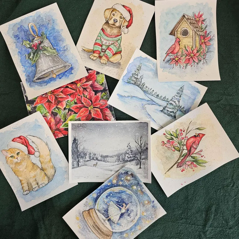 ⭐The advent calendar will be opened one day each day starting December 1st. The envelopes will be numbered 1-24, tied together with string, and mailed in a box. All 24 paintings are holiday or winter themed.