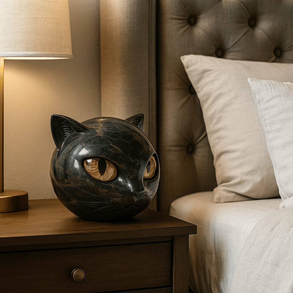 Imagine the moment you place it in your living room or office—the warm reflection in the amber eyes, the soft sheen across its marble finish.