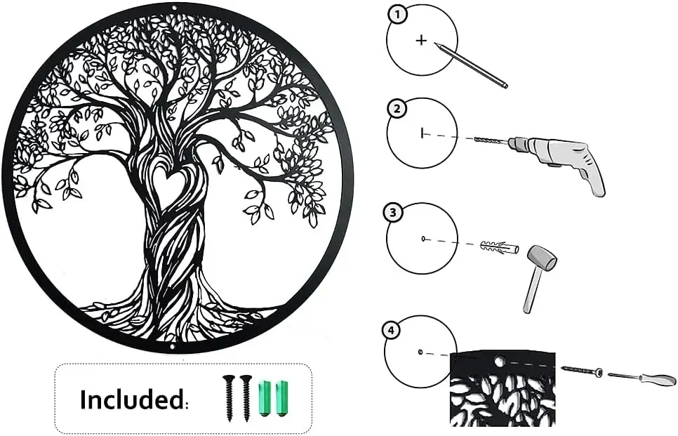 Measuring 11.8 inches (30 cm) in diameter, this wall art is perfectly sized for a variety of spaces—ideal for your living room, bedroom, hallway, or even your garden or porch. It is easy to install with all necessary fittings included; simply drill holes and mount it on any wall or surface.