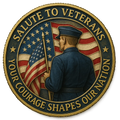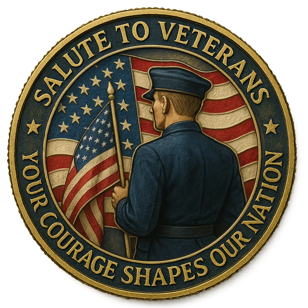 On the front, a soldier stands resolute, holding the American flag 🇺🇸. The bold inscription “SALUTE TO VETERANS” sits atop, while “YOUR COURAGE SHAPES OUR NATION” wraps around the edge. Every detail captures the grit and dedication of those who’ve defended our ideals.