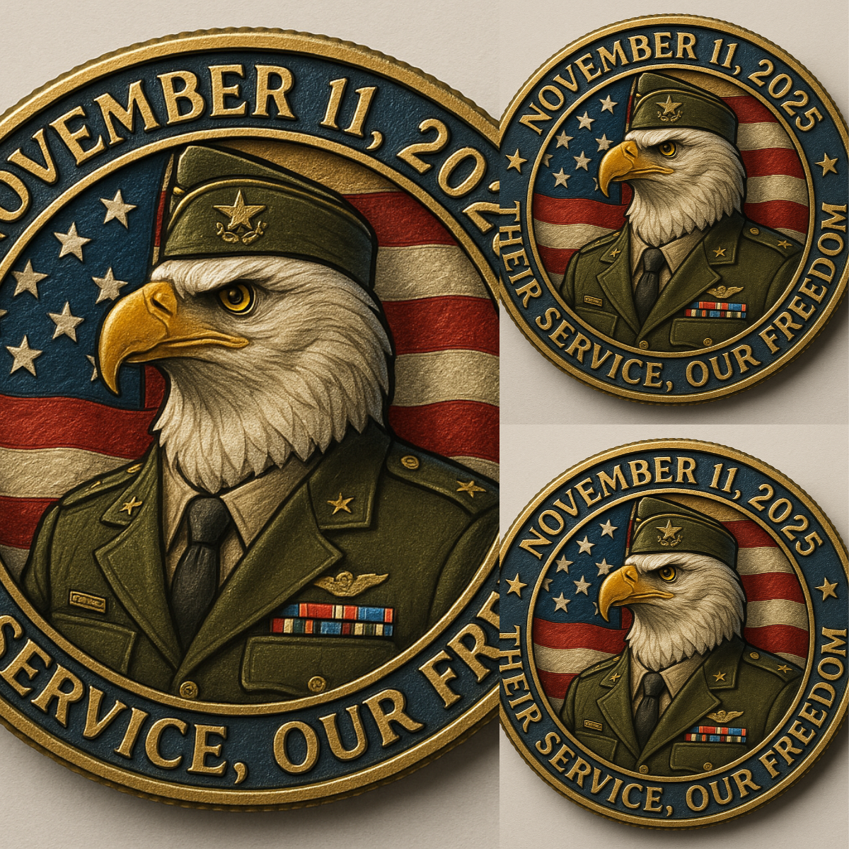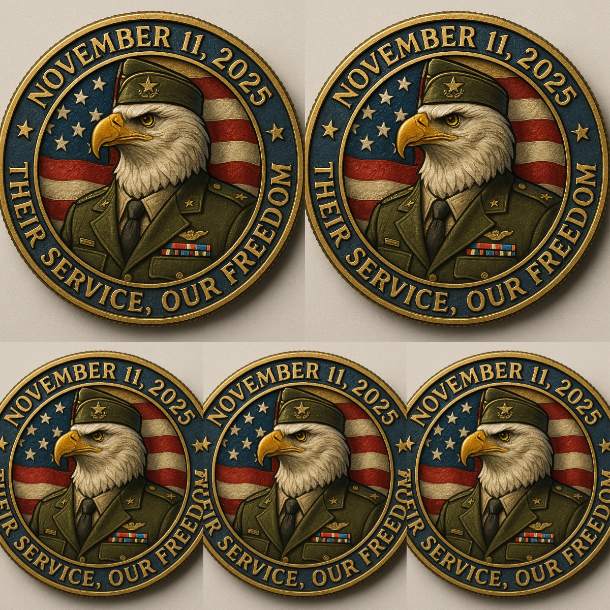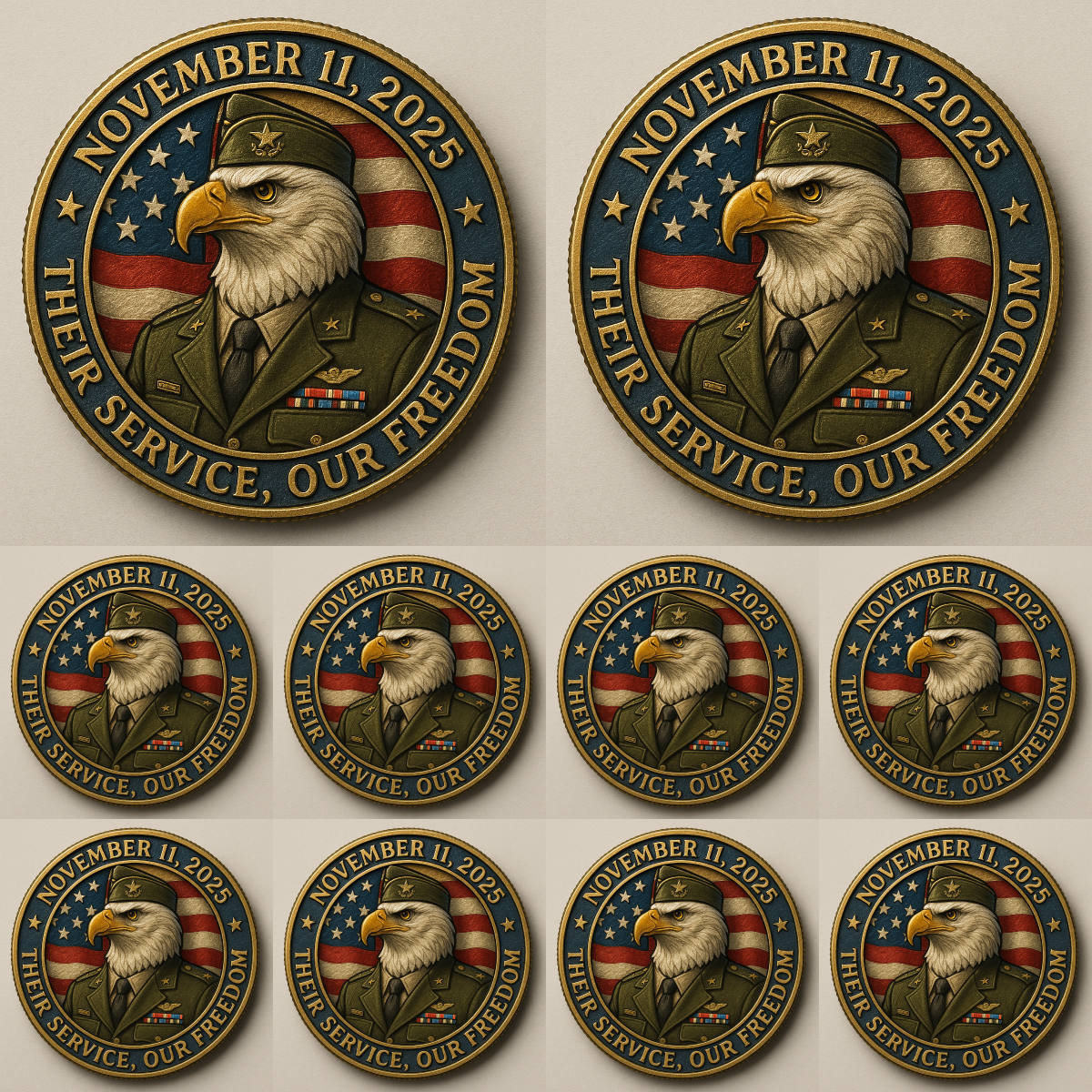 Flip to the back, and you’ll find a majestic eagle 🦅, adorned in a military uniform, symbolizing strength and patriotism. “NOVEMBER 11, 2025” marks the date, and “THEIR SERVICE, OUR FREEDOM” reminds us that liberty comes from sacrifice. The backdrop of stars and stripes ties the design to the heart of America.